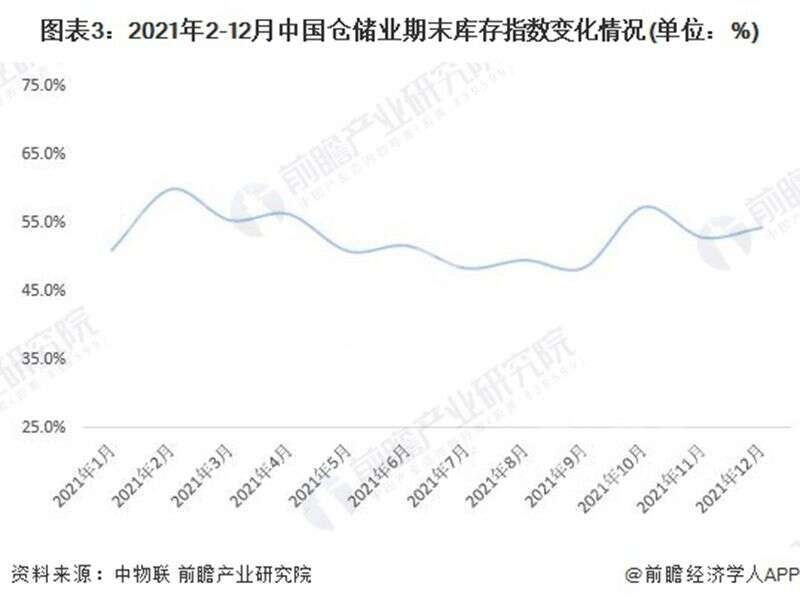 根據(jù)中國物流與采購聯(lián)合數(shù)據(jù),2021年1-12月,中國倉儲業(yè)期末庫存指數(shù)均值為52.9%,保持在榮枯線以上,同比增長2.2個百分點,反映出庫存水平明顯上升,企業(yè)庫存壓力所有上升。