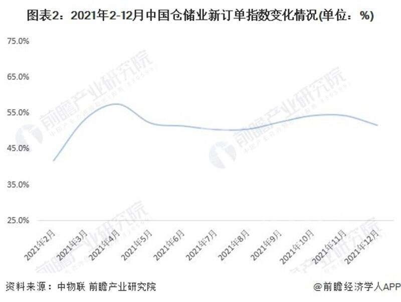從中物聯(lián)發(fā)布的中國倉儲指數(shù)中的新訂單指數(shù)變化情況來看,2021年2-12月中國倉儲業(yè)新訂單指數(shù)均值為51.8%,同比下降0.4個百分點;顯示出倉儲行業(yè)受新冠疫情、全球經(jīng)濟(jì)下行等因素影響導(dǎo)致行業(yè)需求整體趨弱。